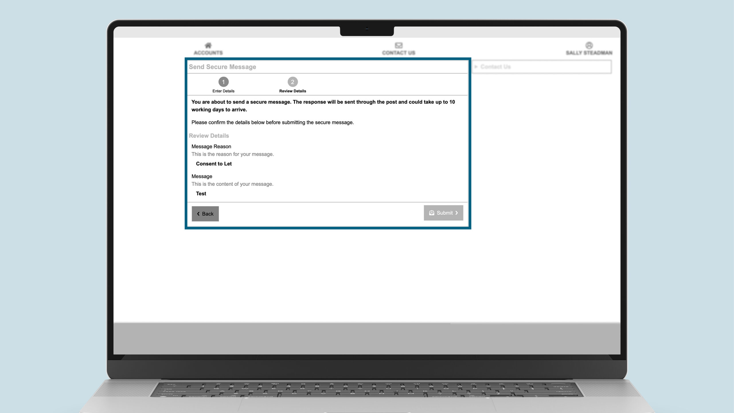 Review your message and click Submit. You’ll then see confirmation that we’ve received our message at the top of your Account Summary screen.