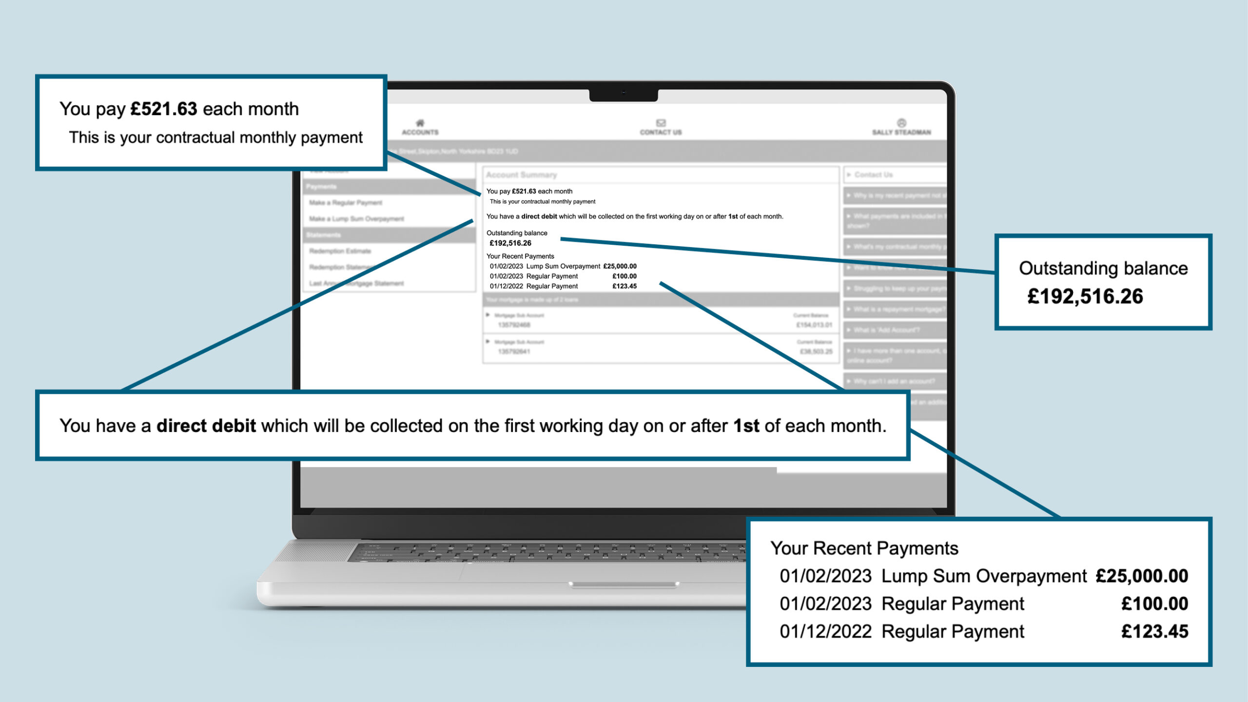The Account Summary screen shows key information about your mortgage, such as your standard monthly payment amount, your payment date (if you pay by Direct Debit) and the total amount you owe. You can also see details of the most recent payments made to your account.