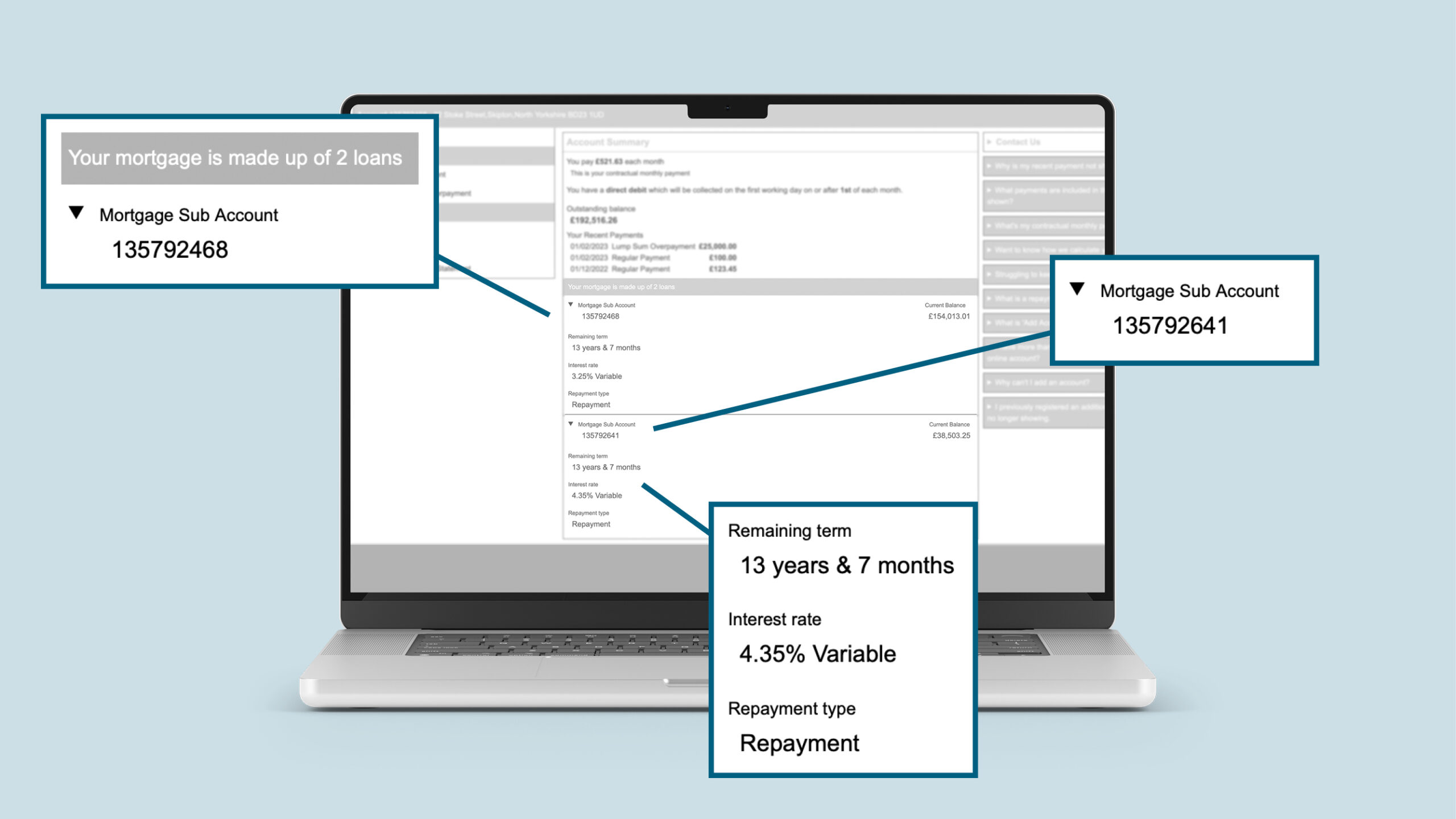 You can see the remaining term (in years and months), current interest rate and repayment type by clicking on your account number shown at the bottom of the Account Summary screen. If your mortgage is split into more than one part, any sub-accounts you have will all be listed here.