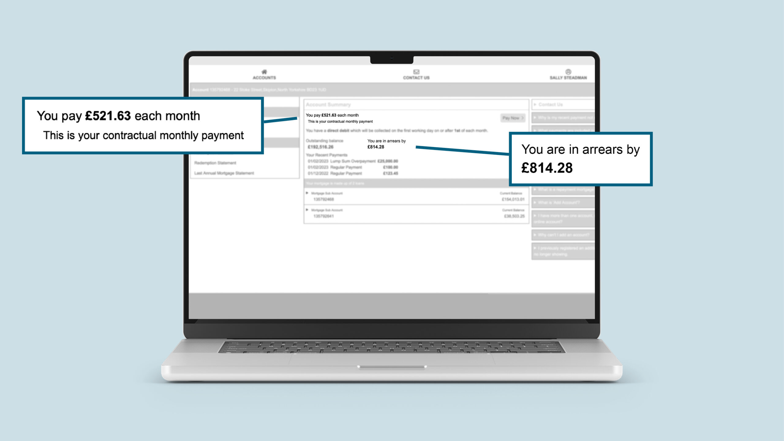 If you’re behind with your mortgage payments and your account is in arrears, you’ll see your current arrears balance and details of any agreed payment arrangement in the Account Summary screen.