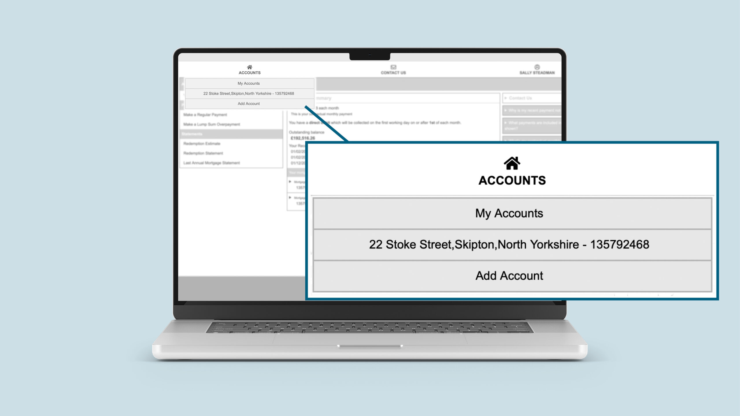 If you’ve got more than one mortgage, just click on Accounts in the top left of the screen. In the pop-up menu, you’ll see a list of each account that you’ve registered on Self-Serve and can click into each one to view more details. You can use Add Account to register other accounts within Self-Serve.